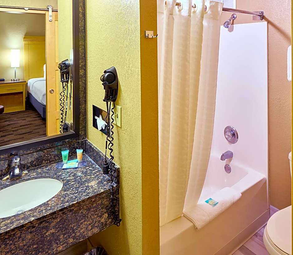 Amenities include free on-site parking, free Wi-Fi, a free business center, and a free fitness center, plus air conditioning, a kid-friendly buffet, non-smoking rooms, an elevator, and free toiletries. Pet-friendly options are available with extra charges, and breakfast is offered to start each day.